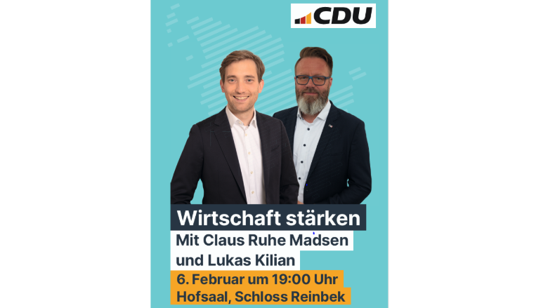 Unser CDU-Landtagsabgeordnete Lukas Kilian lädt gemeinsam mit Claus Ruhe Madsen herzlich zur Veranstaltung „Wirtschaft stärken“ ein. Die Veranstaltung findet am 6. Februar statt und beginnt um 19:00 Uhr im Schloss Reinbek.